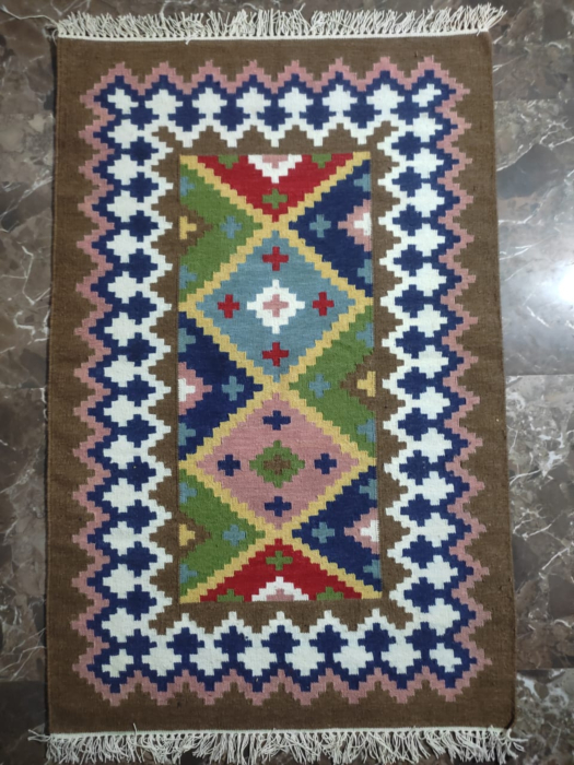 INDIAN HANDMADE WOOLLEN DHURRIE WOVEN ON VERTICAL LOOMS IT IS USED IN A ROOM PARTY MEETING CORRIDOR ON BED SEA SHORE BANK OF RIVER ETC. ITS BIODEGRADABLE AND WASHABLE IT CAN BE WASHED WITH PLAIN WATER WITH LITTLE SODA TO REMOVE DIRT FROM IT AND CAN BE CLEANED BY VACCUM CLEANER.