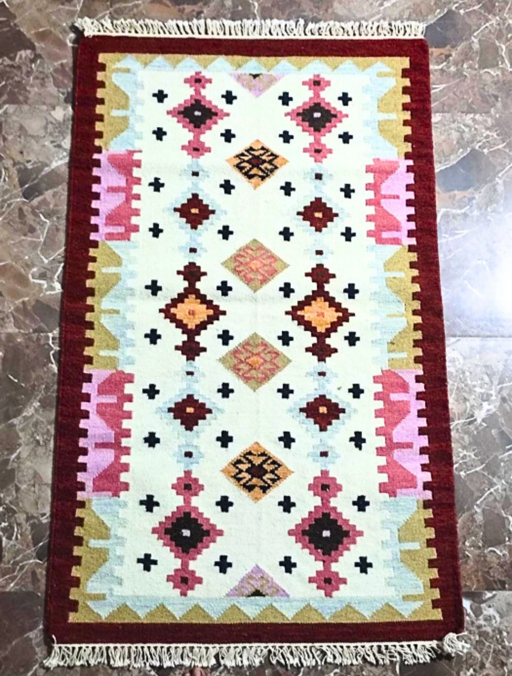INDIAN HAND MADE WOOLLEN DHURRIE WOVEN ON VERTICAL LOOM IT IS USED IN PARK PARTY ROOM CORRIDOR MEETIN ON BED SEA SHORE BANK OF RIVER ETC. ITS BIODEGRADABLE AND WASHABLE IT CAN BE WASHED WITH PLAIN WATER AND LITTLE SODA TO REMOVE DIRT FROM IT IT IS CLEANED BY VACCUM CLEANER