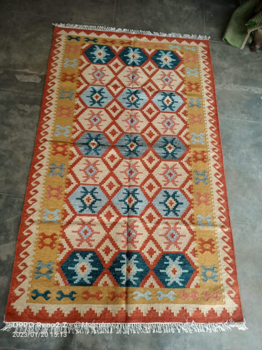 Woolen durry woven on vertical loom & easy to carry. Biodegradable & can be washed by plain water with little soda to remove dirt can be cleaned by vaccum cleaner. It should be kept in roll when not in use.
